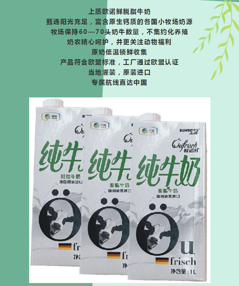 德國進口上質(zhì)歐諾鮮脫脂牛奶1L