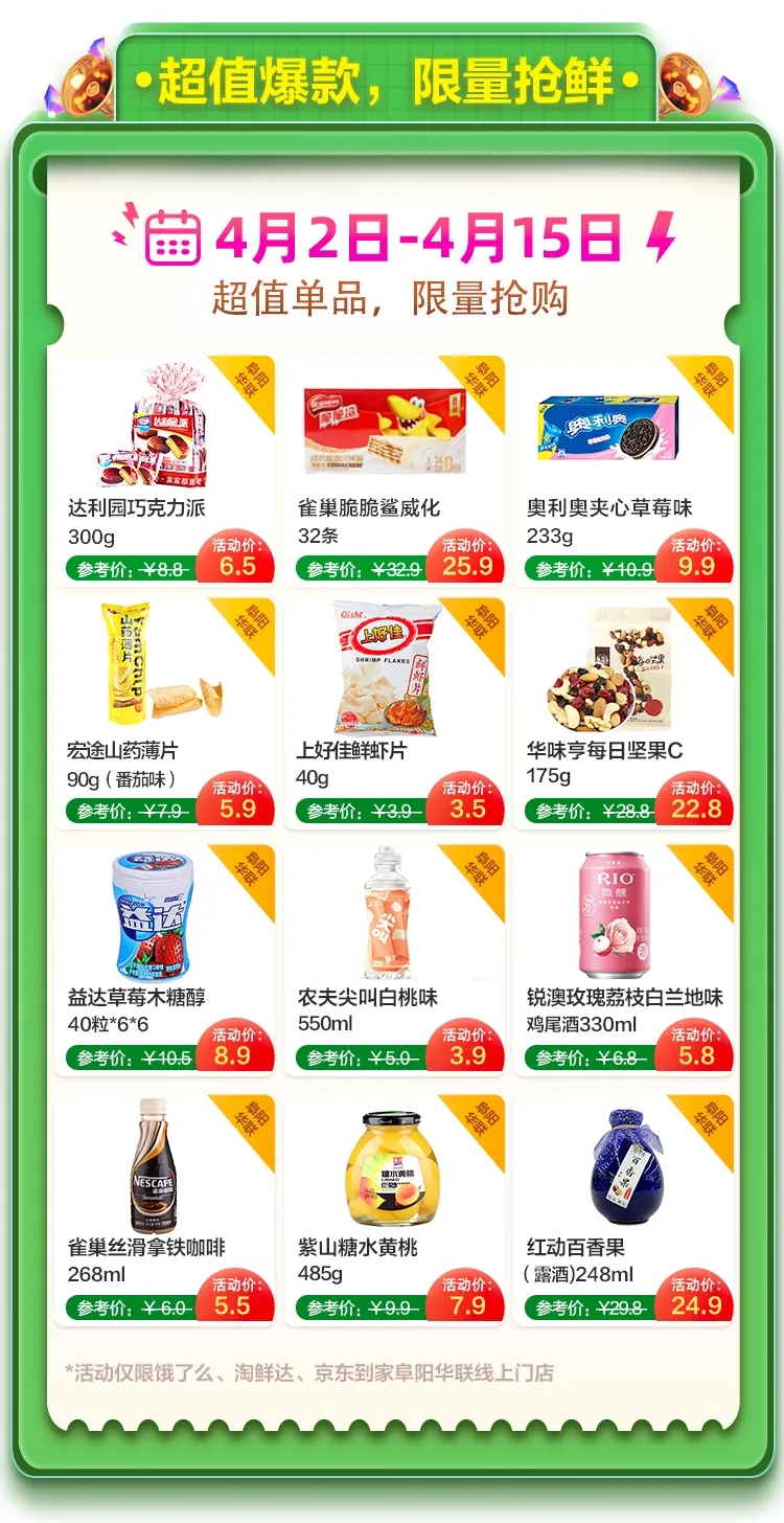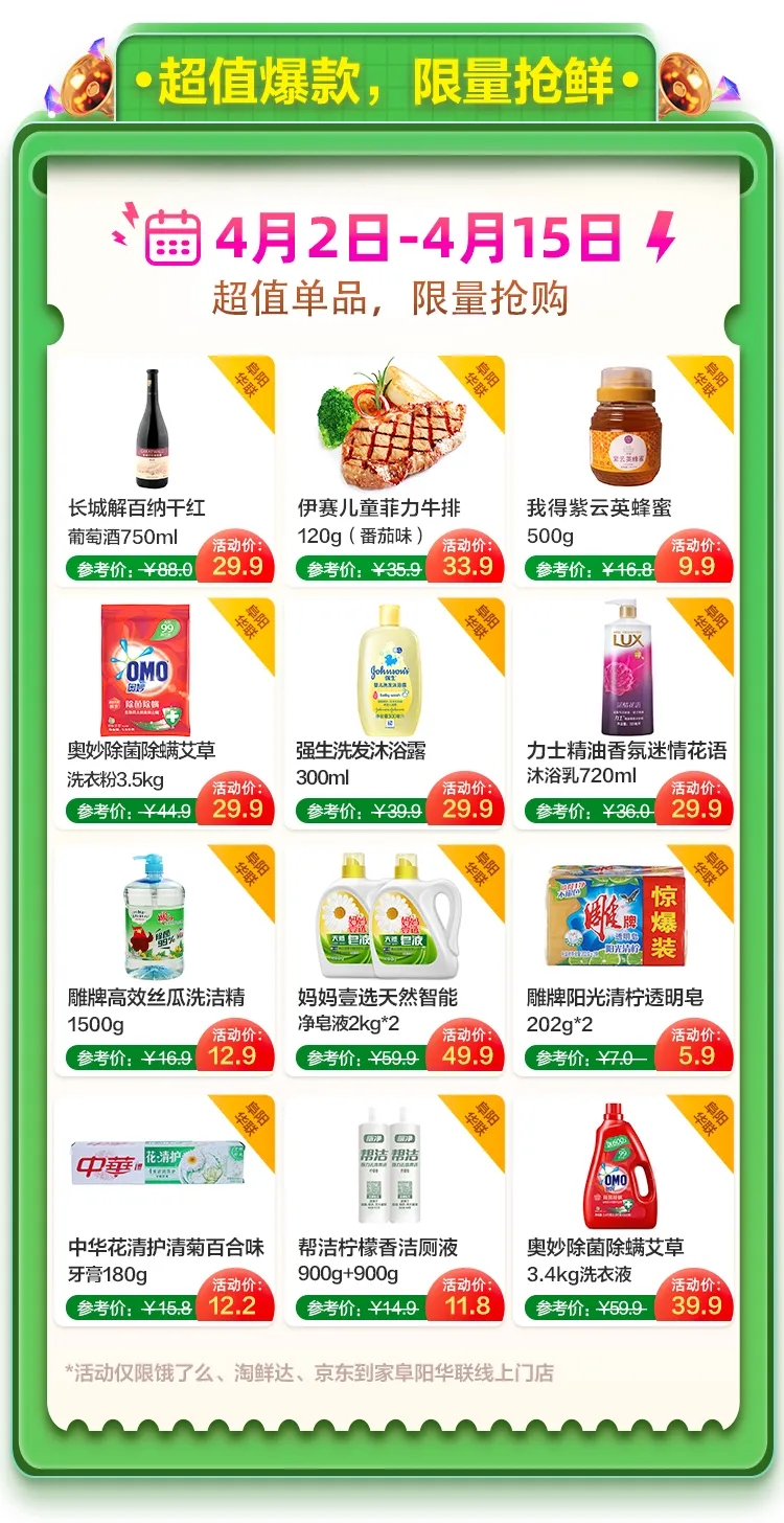 還好你有阜陽華聯(lián),淘寶淘鮮達(dá)、餓了么、京東到家都能下單。線下親眼所見的品質(zhì),